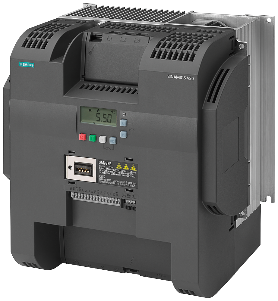 SINAMICS V20 3AC 380-480V -15/+10% 47-63HZ. Potencia Alta sobrecarga: 22KW con150% sobrecarga durante 60segundos.Potencia Baja sobrecarga: 30KW con 110% sobrecarga durante 60 segundos , sin filtro. I/O-interface: 4DI, 2DO,2AI,1AO fieldbus: USS/ MODBUS RTU con BOP incorporado, grado de protección: IP20/ UL OPEN type.Tamaño: FSE 264,5, 243,5, 209 (Al x An x Pr)